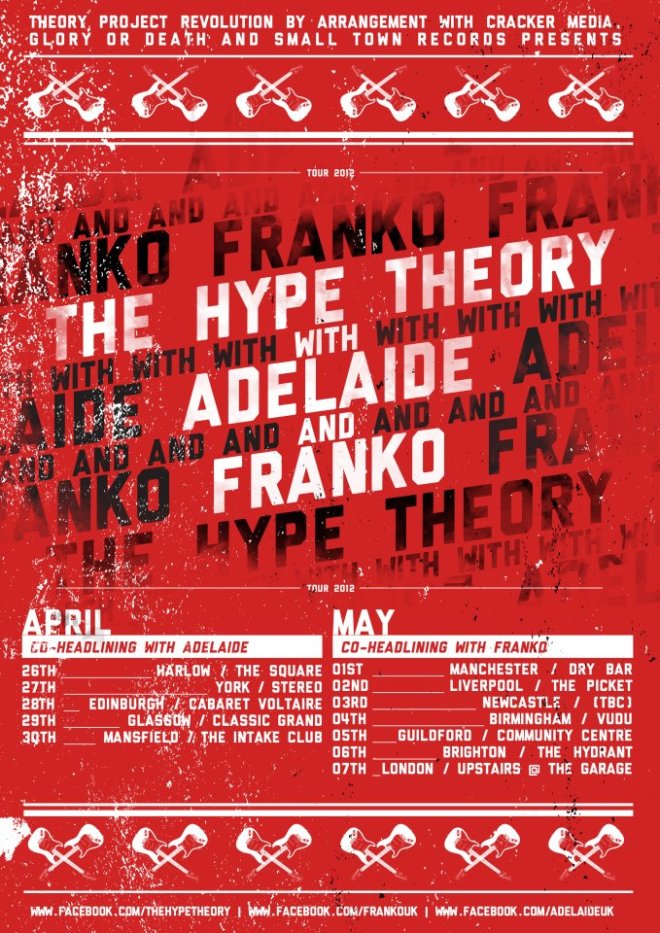 Bubbly Chelmsford based Power Pop Rock band The Hype Theory have announced a super UK tour with those London rockers Adelaide and blistering alt-rockers FranKo (some dates) and supercool 4-piece Punk band Jet Pack (selected dates.)