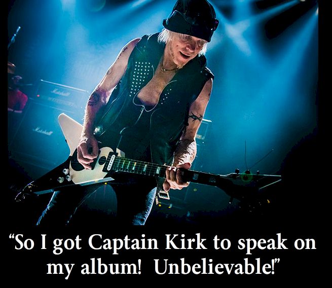 “And then I was jamming with Herman (Rarebell – drums) in Brighton and Pete Way was there (bass player) — they heard the demo and said they wanted to become the rhythm section… And so, I didn’t have to do anything, you know! Before I knew it I had all these incredible musicians… In fact I even got a phone call from William Shatner’s agent (asking if I would play on his album) and I said, “Hey! If you do the introduction to this album, I will play on yours!” So I got Captain Kirk to speak on my album! Unbelievable! ”