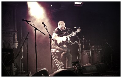 The space was decorated with tea lights sat on ledges in each alcove. These provided a shimmer to the Victorian red brick splendour. David went on stage alone, with a battered guitar. He looked like a worker in a smoke-filled oven, his face transfigured by blazing glow.