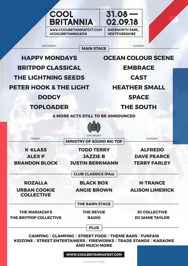 Cool Britannia will feature some of the best of British rock and dance music. The Main Stage will headline HAPPY MONDAYS and OCEAN COLOUR SCENE — with amazing supporting artists such as Embrace, The Lightning Seeds, Peter Hook & The Light, Cast, Heather Small, Dodgy, Space, Toploader, The South and many more acts yet to be announced.
