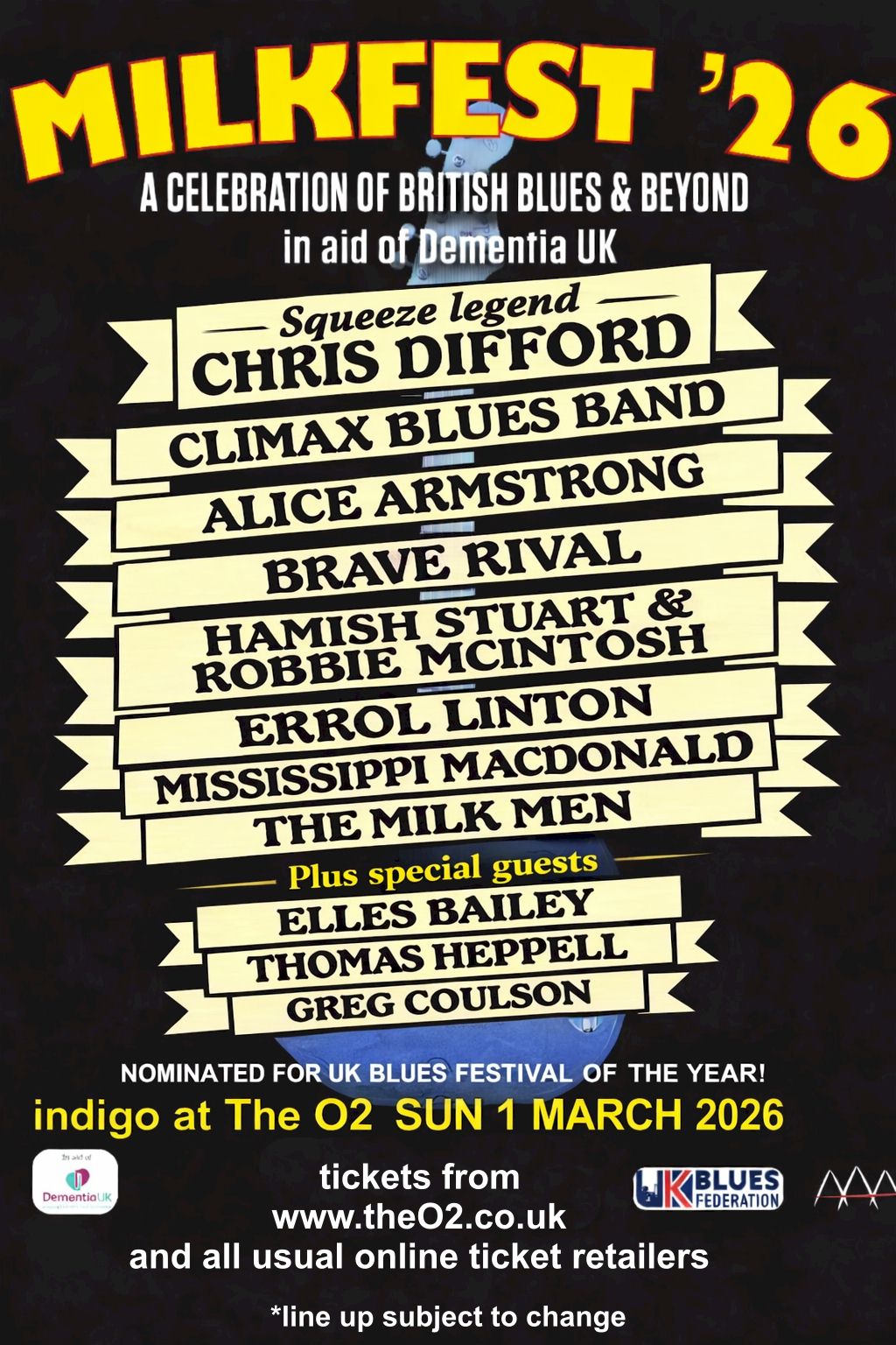 MILKFEST– a charity live music event that celebrates the best of British blues for a single day at London’s Indigo at the O2, has been nominated for Best UK Blues Festival at the UK Blues Awards.
